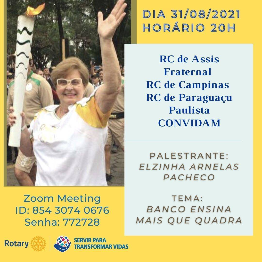 O Rotary Club de Assis Fraternal recebe Elzinha Arnelas Pacheco que fara palestra com o tema: "O Banco Ensina Mais Que Quadra". Para essa reunião contaremos com a presença dos companheiros do Rotary Club de Campinas e Rotary Club de Paraguaçu Paulista. Dia 31/08 às 20:00 através da plataforma Zoom. Link: https://us02web.zoom.us/j/85430740676?pwd=VFFQeGJqeW5jeldls0RubXcxTIKrZz09