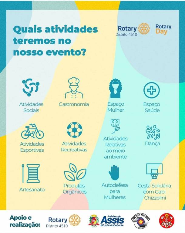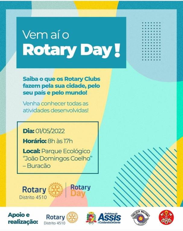 O "4º Rotary Day" será realizado no Parque Buracão no domingo, 1º de maio, das 8h às 17h. O Evento é uma parceria dos Rotary Clubs de Assis, de Assis Norte, de Assis do Vale, de Assis Fraternal, Rotaract Club de Assis Norte e Satélite de Assis do Vale-Amizade. Será um dia cheio de atividades, com shows de dança, apresentação circense, vários cantores, testes na area da saude, esportes e muito mais. Traga 1 litro de leite que será doado a entidades de Assis.