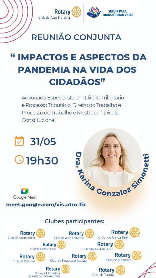Convidamos a advogada Drª Karina Gonzalez Simonetti para falar sobre os Impactos e Aspectos da Pandemia na vida dos Cidadãos. Esta reunião contará com a presença dos companheiros dos seguintes clubes: Rotary Club de Adamantina, de Garça Real, de Marilia-Leste, de Marilia 4 de Abril, de Palmital, de Paraguaçu Paulista, de Rinópolis, Satélite de Assis do Vale-Amizade e de Tarumã.